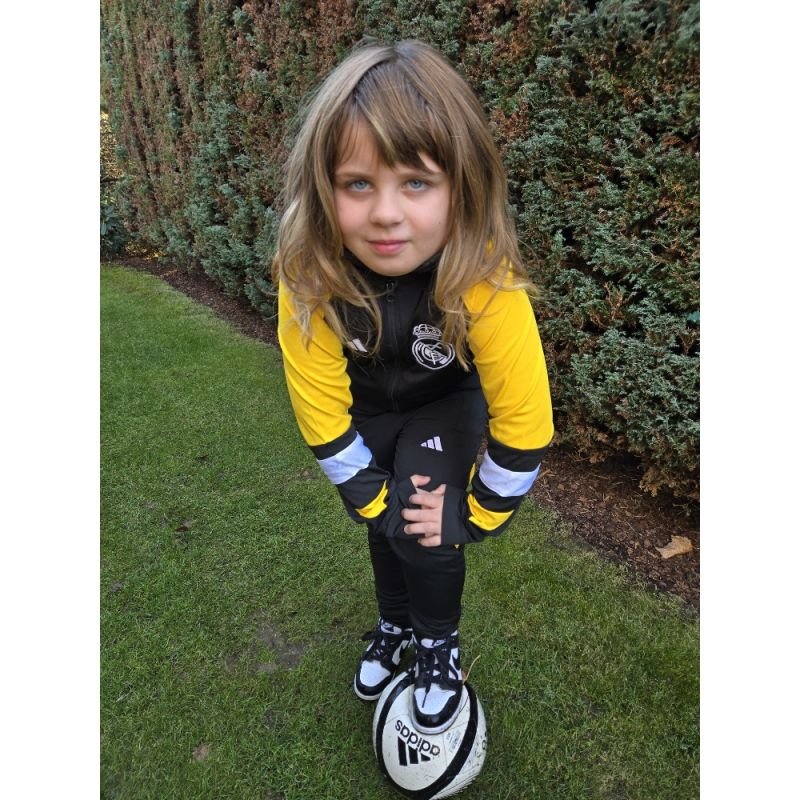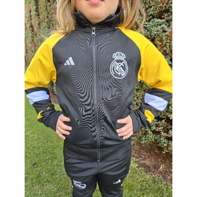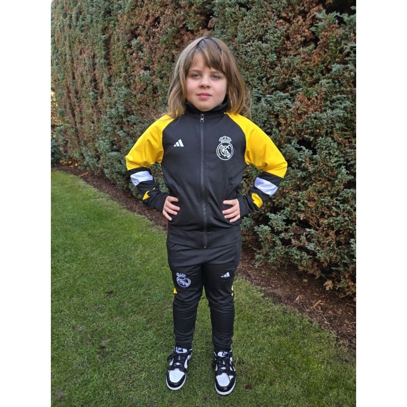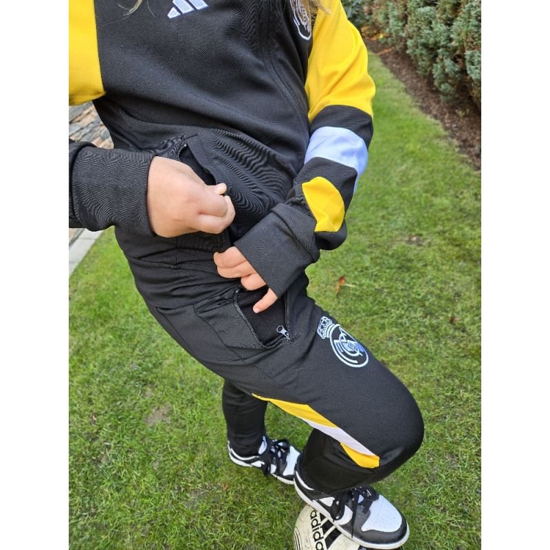 Dětská fotbalová tepláková souprava Real Madrid bude věrným společníkem Vašich dětí v kterékoliv situaci. Ať už trénují na hřišti, sedí doma na gauči nebo jsou na cestě do tělocvičny. Souprava se skládá z tepláků a bundy. Je pružná, nemačkavá, příjemná a dobře se o ni pečuje. Postranní kapsy na bundě i u tepláků nabízí dost místa na potřebné předměty. Vaše děti budou spokojené!